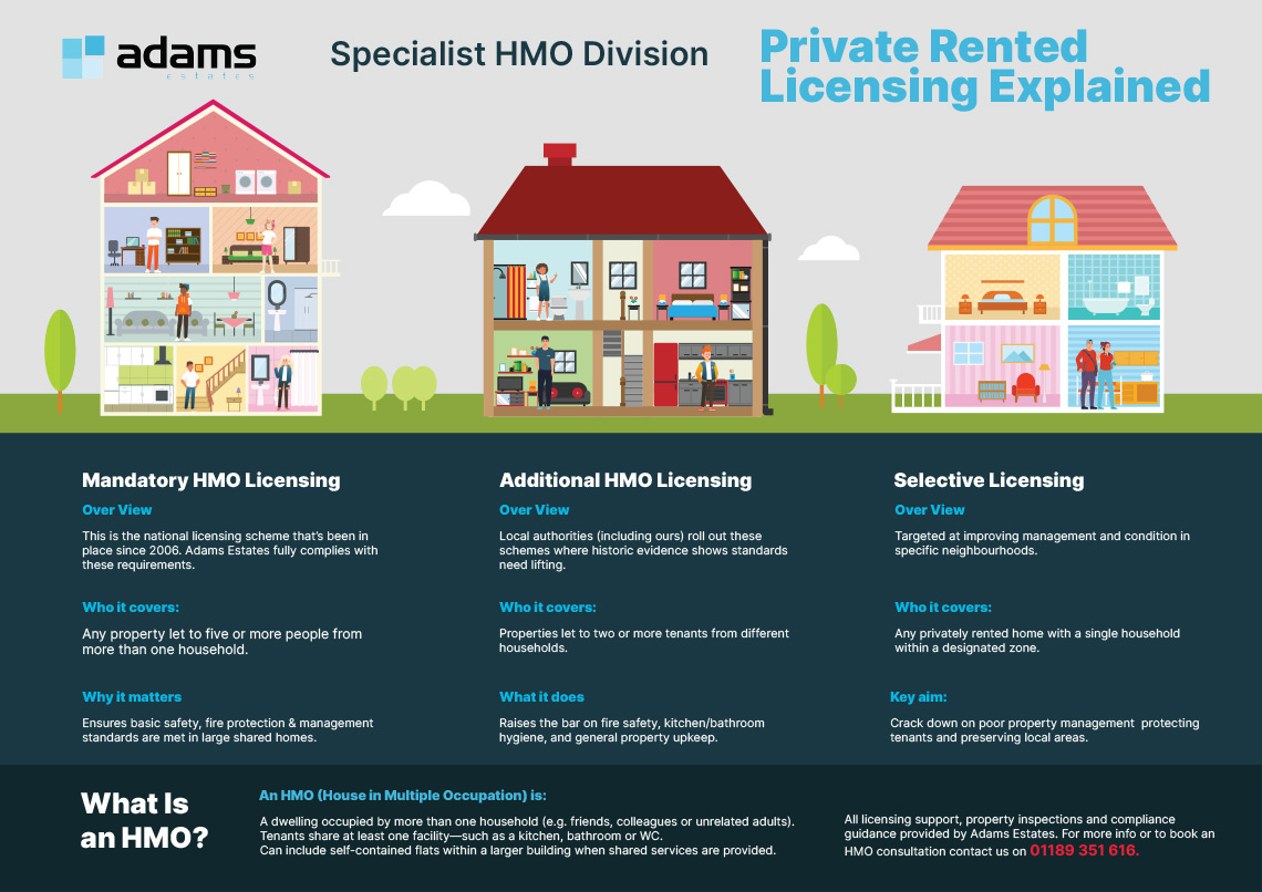 A mandatory licence is needed for any property housing five or more tenants forming more than one household. Smaller HMOs may also fall under additional local licensing schemes. Always verify with your local authority regarding licensing requirements. The team at Adams Estates can assist you with the licensing process and ensure compliance.